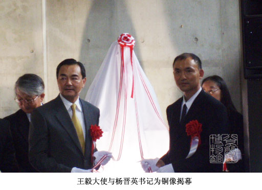 揭幕式舉行之前,北京魯迅博物館楊晉英書記和蘆原市橋本達(dá)也市長在東北大學(xué)百周年紀(jì)念事業(yè)室工作人員的陪同下,拜會了東北大學(xué)井上明久校長,并參觀了當(dāng)年魯迅學(xué)習(xí)解剖學(xué)課程的階梯教室。儀式上,王毅大使、東北大學(xué)校長、楊晉英書記、仙臺市與蘆原市政府官員,以及魯迅及藤野先生的后代等共同為銅像揭幕。王毅大使、楊晉英書記、橋本達(dá)也市長還分別致辭,對此次揭幕式的舉行表達(dá)熱烈祝賀。王毅大使指出,《藤野先生》一文一直被編入中國的中學(xué)教科書,很多中國人對日本人的了解便源于這篇膾炙人口的文章。藤野先生