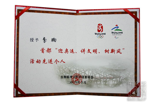 我館李楠同志被首都精神文明建設(shè)委員會(huì)于2008年10月授予“首都‘迎奧運(yùn)、講文明、樹新風(fēng)’活動(dòng)先進(jìn)個(gè)人”榮譽(yù)證書。