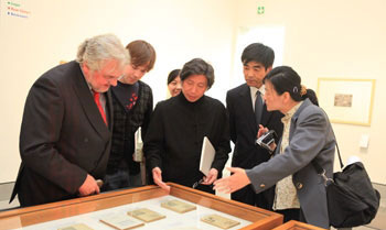 開幕式結(jié)束后,中國美術(shù)館館長范迪安、我館副館長趙國順、上海魯迅紀(jì)念館副館長王錫榮陪同根特市文化局局長Liven Decaluwe觀看了整個展覽。范迪安館長向Liven Decaluwe局長詳細(xì)介紹了魯迅收藏的麥綏萊勒作品集。