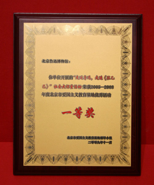 我館在此表彰中榮獲“2005-2008年度北京市愛國(guó)主義教育基地先進(jìn)單位”。我館開展的“走近魯迅,走進(jìn)《孔乙己》”社會(huì)大課堂活動(dòng)榮獲2005-2008年度北京市愛國(guó)主義教育基地優(yōu)秀活動(dòng)一等獎(jiǎng)。