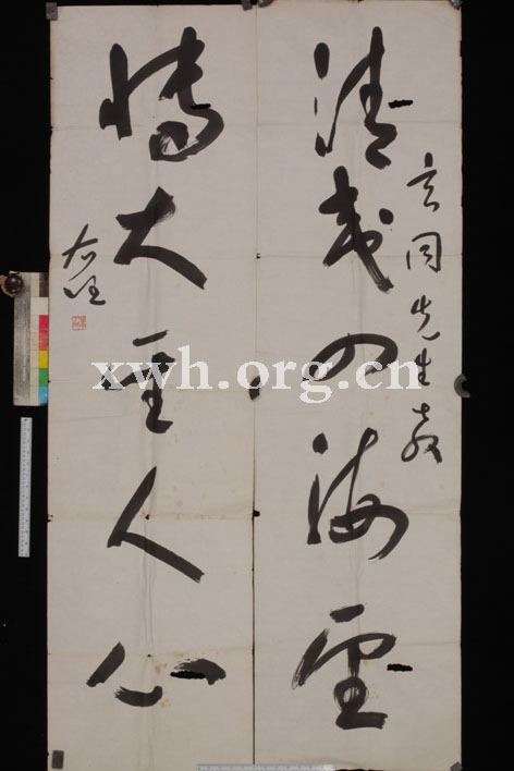于右任為錢玄同書寫一幅對聯(lián)。兩聯(lián)為:“清夷四海望,博大圣人心”,上款“玄同先生教”落款“右任”,并有朱文“關(guān)中于氏”印章。聯(lián)意:清平淡薄被四海仰望,胸懷博大寬廣圣人心腸。