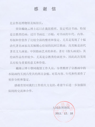 北京魯迅博物館副研究員戴曉云博士應(yīng)大同博物館邀請,整理鑒定其館藏明清書畫,特別是宗教畫。
