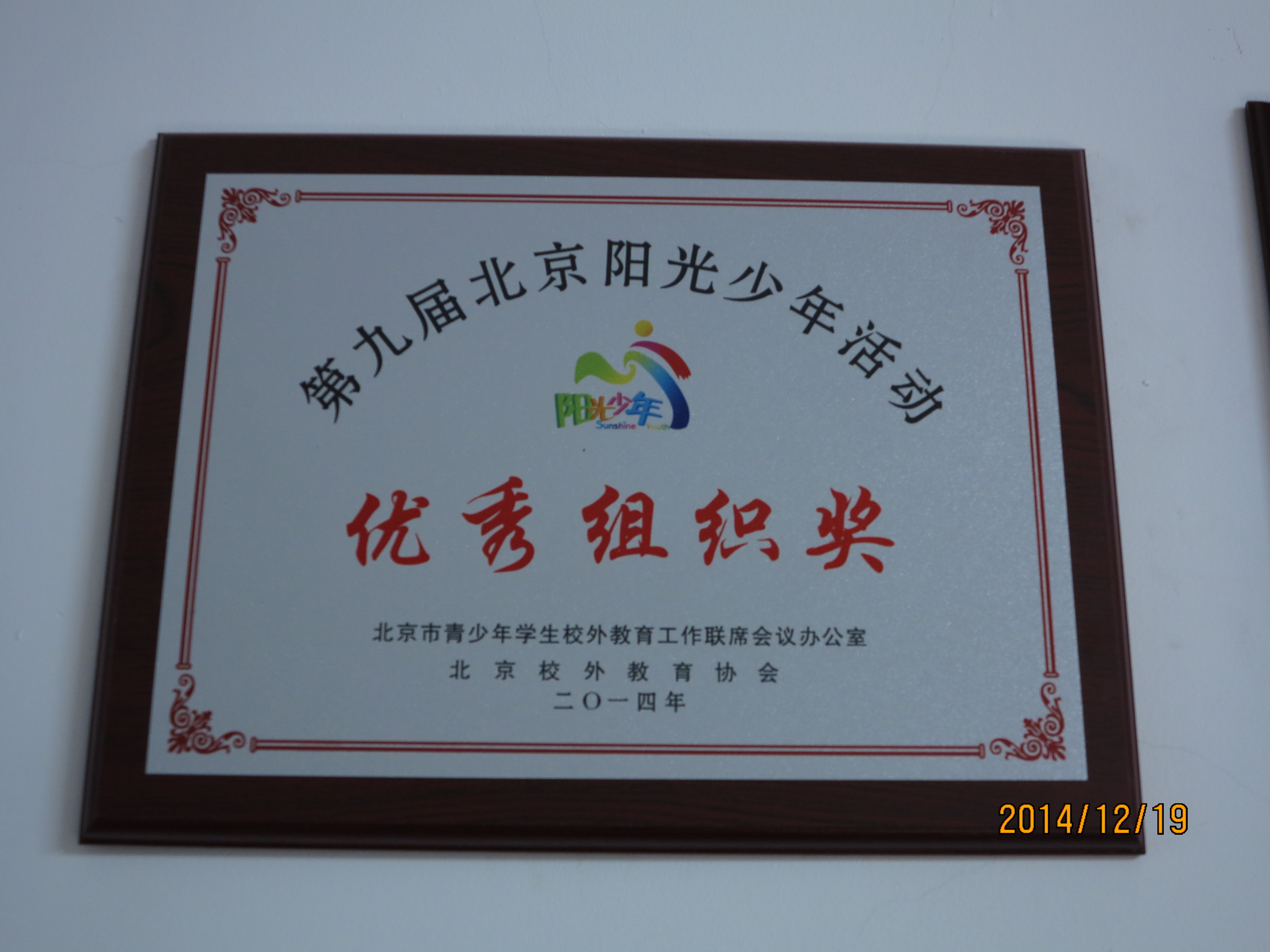 2014年12月12日,在北京市校外教育先進集體表彰大會上,我館榮獲由北京市青少年學(xué)生校外教育工作聯(lián)席會議辦公室、北京市教育委員會及北京市人力資源和社會保障局聯(lián)合頒發(fā)的“北京市校外教育先進集體”暨“第九屆(2014)北京陽光少年活動優(yōu)秀組織獎”。