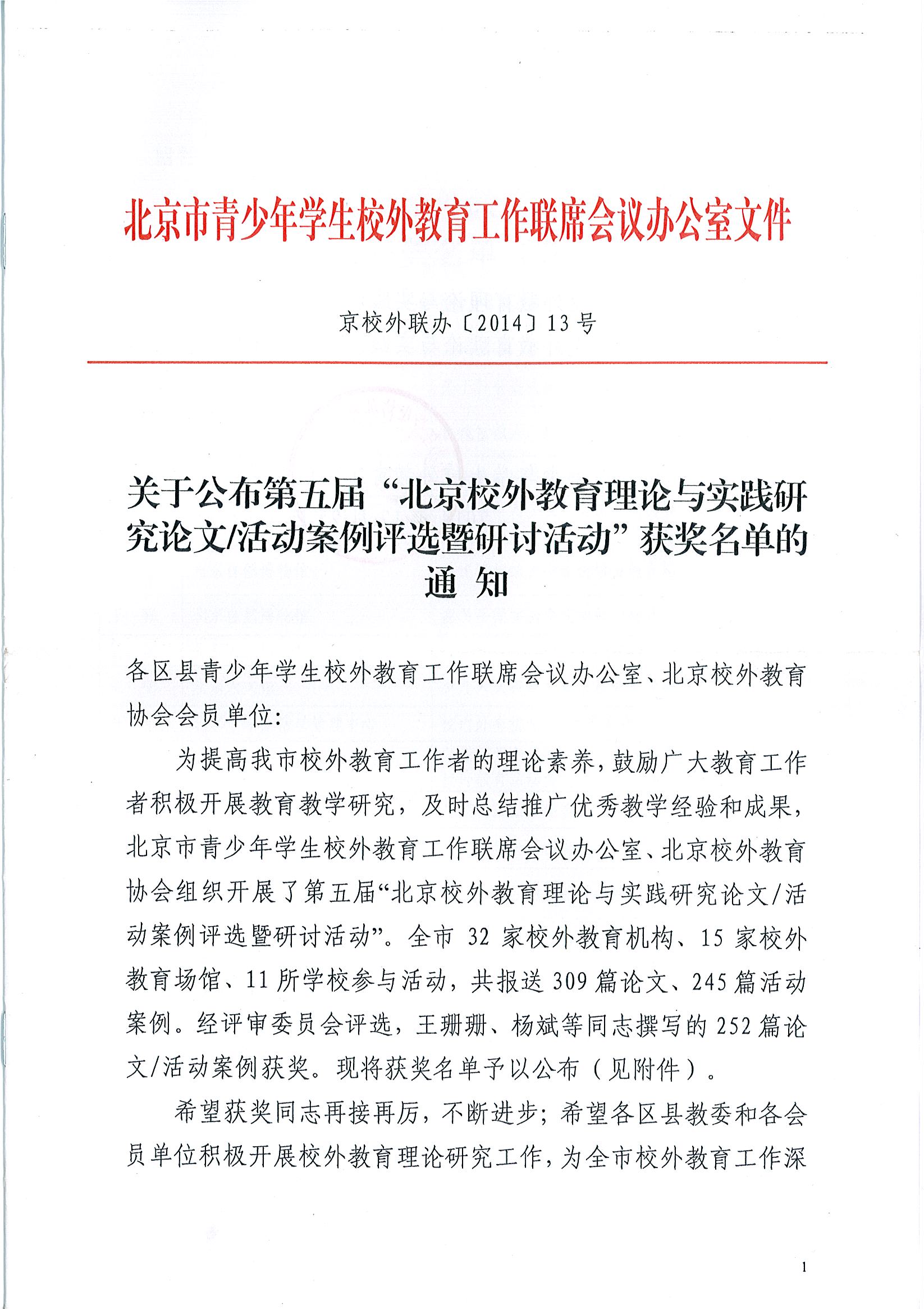 根據(jù)北京市青少年學(xué)生校外教育工作聯(lián)席會議辦公室通知,我館社會教育部劉晴同志撰寫的“三味書屋互動學(xué)習(xí)室方案”榮獲“陽光少年活動優(yōu)秀案例”二等獎(jiǎng)。