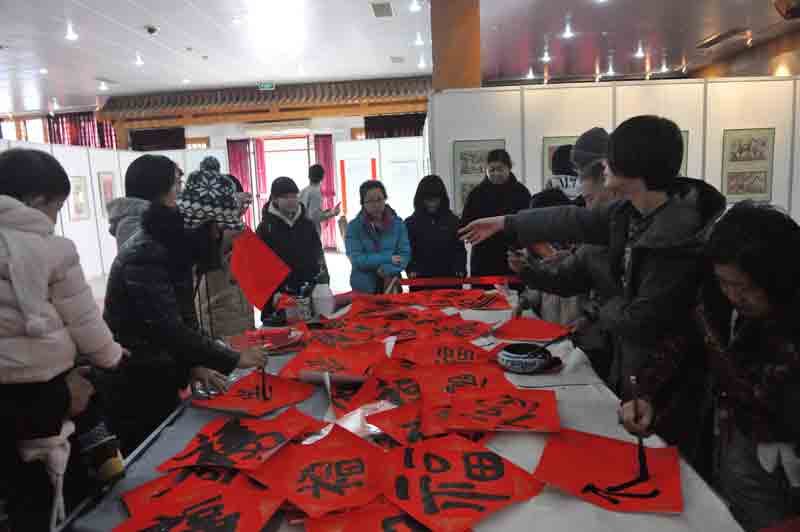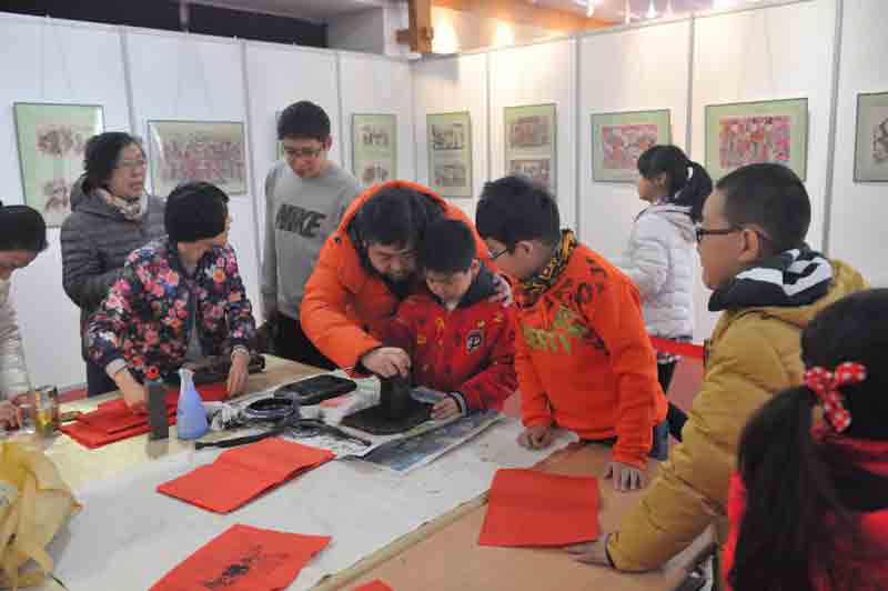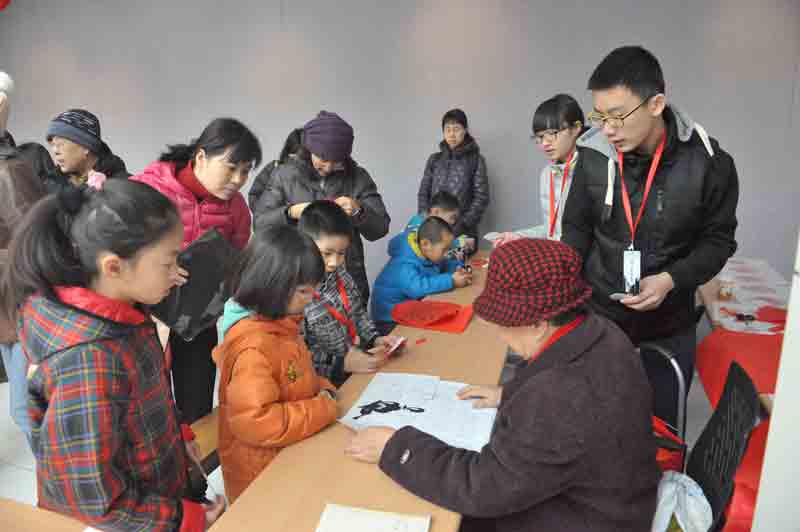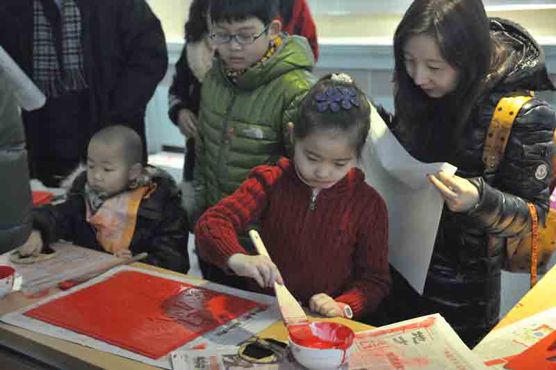 2015年2月17日,在辭舊迎新之際,北京魯迅博物館(北京新文化運(yùn)動(dòng)紀(jì)念館)舉辦了“看年畫過大年”親子文化教育活動(dòng)?;顒?dòng)內(nèi)容主要有:賞年畫、印年畫、寫福字、送春聯(lián)、畫臉譜、捏面人等,國(guó)家“非物質(zhì)文化遺產(chǎn)保護(hù)項(xiàng)目”泥塑彩繪臉譜代表性傳承人佟秀芬女士和中國(guó)民間工藝美術(shù)大師、面塑藝術(shù)家張寶琳先生的到來(lái)為此次活動(dòng)增添了不少光彩,他們現(xiàn)場(chǎng)展示精湛技藝和優(yōu)秀作品,教授孩子們捏面人、畫臉譜。孩子們?cè)诶蠋煹膸ьI(lǐng)下,傾聽老師講述魯迅故事和木刻運(yùn)動(dòng)、魯迅和傳統(tǒng)木板水印技藝,用傳統(tǒng)木板水印拓印魯迅藏外國(guó)版畫名作模板,體驗(yàn)現(xiàn)代版畫和古老的木板水印技藝交相輝映的魅力。