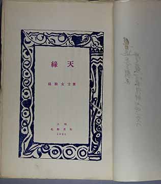 《綠天》一出版,蘇雪林很快就送給了魯迅。在扉頁上用黑色鋼筆寫了:“魯迅先生校正學(xué)生蘇雪林謹(jǐn)贈(zèng)七、四、一九二八”。版權(quán)頁的留印處還加蓋了“綠漪”朱紅印章。不過現(xiàn)在魯迅博物館的這部“魯迅藏書”,毛邊,卻沒有裁開,似乎魯迅沒有讀過。實(shí)際上“魯迅藏書”中另有一本,也是毛邊,卻裁開了,翻過了。是魯迅特意為保存贈(zèng)書的原貌,另買來一部閱讀呢,還是在蘇雪林贈(zèng)書前就買了一本來閱讀了?如果是前者,可見魯迅對(duì)這本書的珍重;是后者,又可見魯迅關(guān)注這本書的熱情,因?yàn)閺臅某霭娴教K雪林贈(zèng)書,時(shí)間不到一個(gè)月。