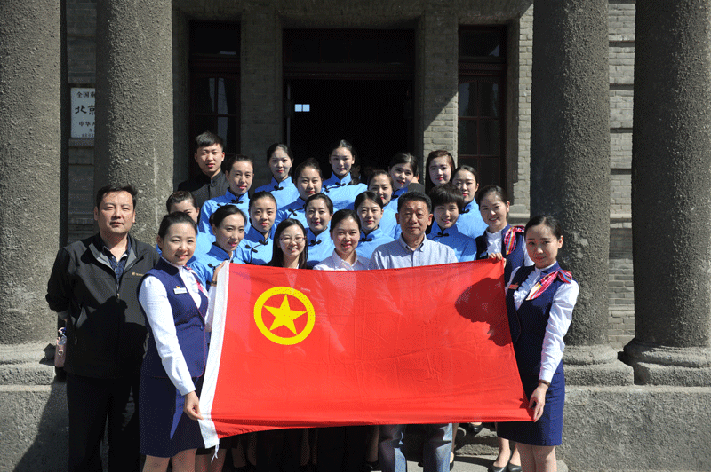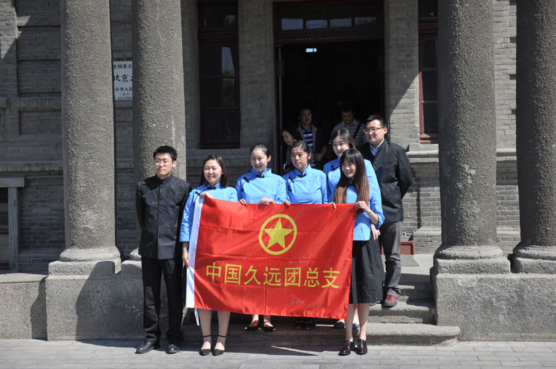 中國(guó)久遠(yuǎn)團(tuán)總支著五四時(shí)期學(xué)生服裝在紅樓前合影留念