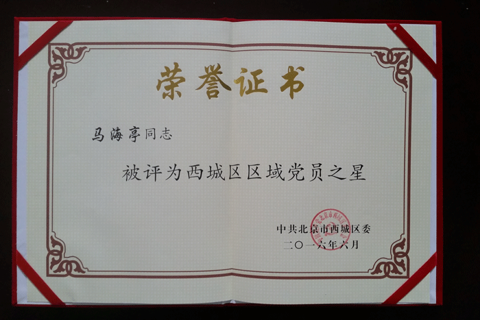 馬海亭同志被中共北京市西城區(qū)委評為“西城區(qū)區(qū)域 黨員之星”