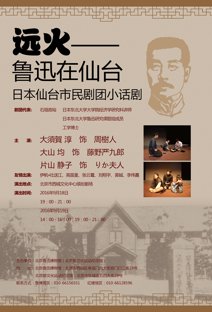 2016年9月18——19日,為了紀(jì)念魯迅誕辰135周年、逝世80周年,受北京魯迅博物館(北京新文化運(yùn)動(dòng)紀(jì)念館)邀請(qǐng),日本NPO劇團(tuán)仙臺(tái)小劇場來華進(jìn)行中日友好交流活動(dòng),并在北京西城文化中心演出兩幕十場話劇《遠(yuǎn)火——魯迅在仙臺(tái)》。劇團(tuán)共演出三場,來自北京大學(xué)、中國人民大學(xué)、中國傳媒大學(xué)、北京師范大學(xué)、北京外國語大學(xué)、空軍指揮學(xué)院和北京35中、159中學(xué)等院校師生、學(xué)生家長一起觀看演出,參加“魯迅遺產(chǎn)與當(dāng)代中國”國際學(xué)術(shù)研討會(huì)的代表,國家文物局系統(tǒng)團(tuán)員青年以及在京魯研專家、魯迅愛好者也慕名觀看了演出。演出前,常務(wù)副館長黃喬生、副館長何洪會(huì)見全體演職人員,并與他們親切交談。