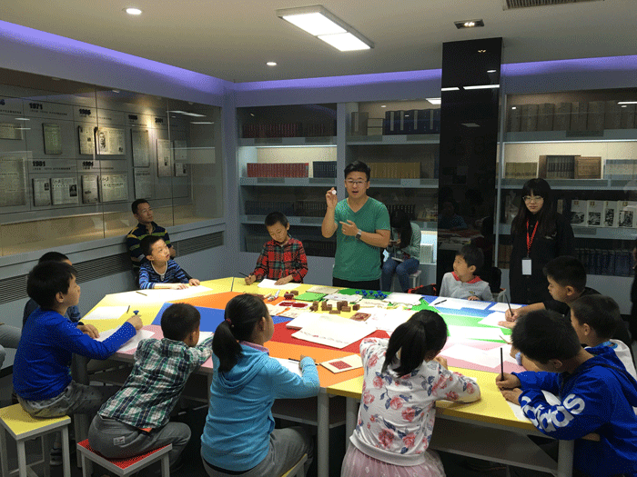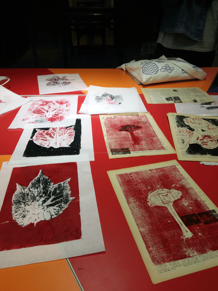 10月5~7日推出第二個主題活動——“紙上春秋—書畫與落葉的散文詩”,“一葉知秋”把樹葉、油墨和舊報紙結(jié)合起來,讓參與者體驗波普范兒的版畫漏印設(shè)計;“翰墨書香”、“書畫‘封’情”從魯迅珍藏藏書票拓印到藝術(shù)書皮創(chuàng)作,不僅可以學習現(xiàn)代版畫拓印技巧,也是對藏書文化的一次深度接觸。通過對魯迅書刊設(shè)計的學習,參與者會深切體會到魯迅在書籍裝幀設(shè)計上得匠心獨運。