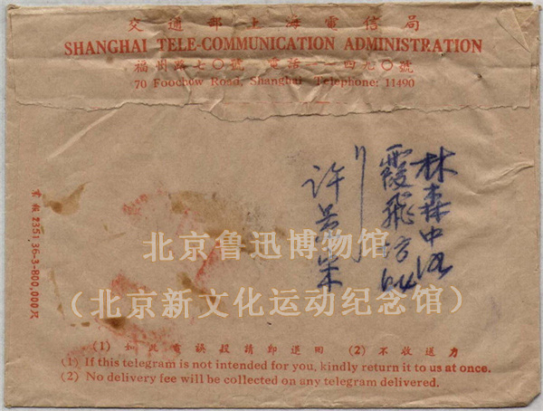 名稱:阮紹先致許廣平朱安逝世的電報(bào)
