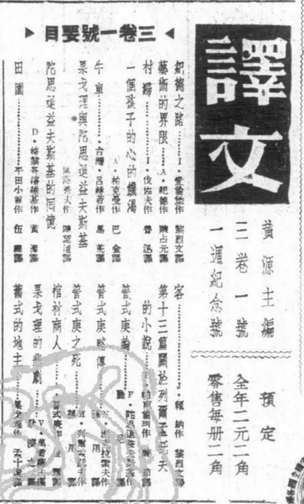 魯迅本著對讀者負責的態(tài)度為《譯文》規(guī)劃譯稿,努力維護、提升《譯文》在文學翻譯界的聲譽。按計劃,《譯文》第三卷第一期將在1935年9月發(fā)行,原本《一周年紀念號》卻成為《終刊號》。16日,魯迅告訴黃源:“頃見《申報》,則《譯文》三卷一期目錄,已經(jīng)登出,上云‘要目’,則刊物出來后,比‘要目’少了不少,倒是很不好的”[77]?!渡陥蟆奉A告的“三卷一號要目”共計16篇,《終刊號》刊登了預告“要目”中的12篇,其中4篇未能如期刊登,分別是巴金譯A·柏克曼《一個孩子的心的饑渴》、黃源譯D·格黎哥洛維基《陀思退益夫斯基的回憶》、伍禪譯平田小六《田園》、孟十還譯果戈理《舊式的地主》[78]。《終刊號》新增黃鐘譯L·修史《無恥的柯拉》。最終《終刊號》呈現(xiàn)給讀者的是13篇,尚不至“少了不少”,影響也不至于“很不好”。