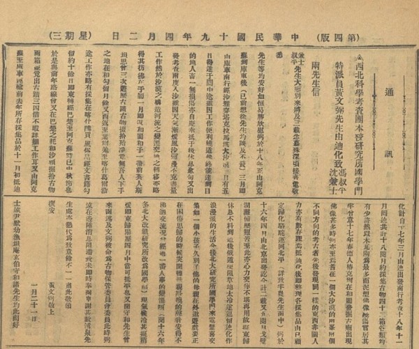 西北科學(xué)考查團(tuán)本校研究所國學(xué)門特派員黃文弼先生由迪化致馬叔平、沈兼士兩先生信,刊登在《北京大學(xué)日刊》第2376號,1930年4月2日第4版。此信簡單交代了黃文弼在沙雅等地的考古工作,以及黃文弼在新疆的采集品情況。同時表達(dá)了黃文弼對北大研究所國學(xué)門的思念之情和對被任命為古物保管委員會委員的感激之情。