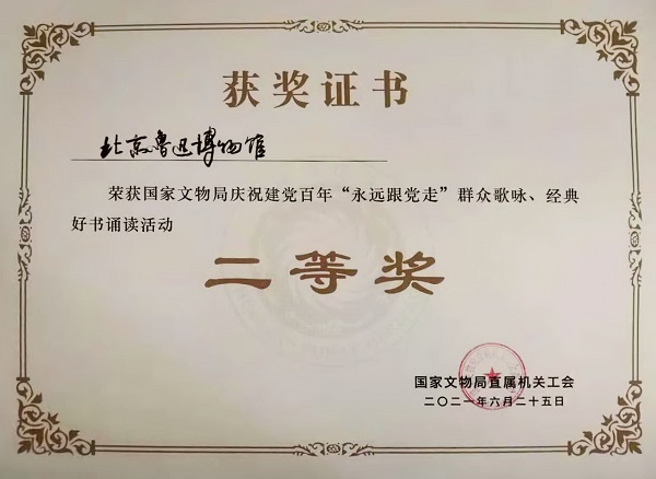 北京魯迅博物館(北京新文化運動紀念館)在國家文物局“永遠跟黨走”群眾歌詠、經(jīng)典好書誦讀活動中榮獲二等獎
